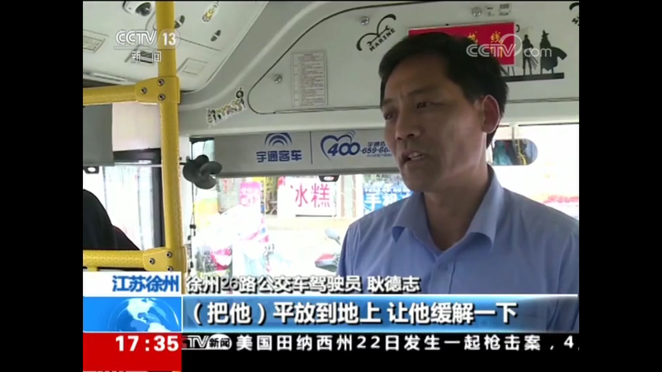 耿德志和昝昱安一邊招呼乘客前來幫忙一邊撥打120。一名自稱是護士的女乘客說男乘客是癲癇病發(fā),在乘客的齊心幫助下讓男乘客平躺在車廂,把頭歪到一邊,并防止他咬到自己的舌頭。為爭分奪秒救治患病乘客,耿德志在征得車上乘客同意、請示過公司領導后,公交車緊急變身“120”,5分鐘就將車直接開到了距離最近的徐州礦務集團第一醫(yī)院的急診室門口。耿德志在車上照顧發(fā)病乘客,昝昱安和熱心乘客一起跑到急診喊來醫(yī)護人員??吹结t(yī)護人員實施救治,并聯(lián)系到患病乘客的家人后,耿德志和昝昱安才放心地回到崗位上。