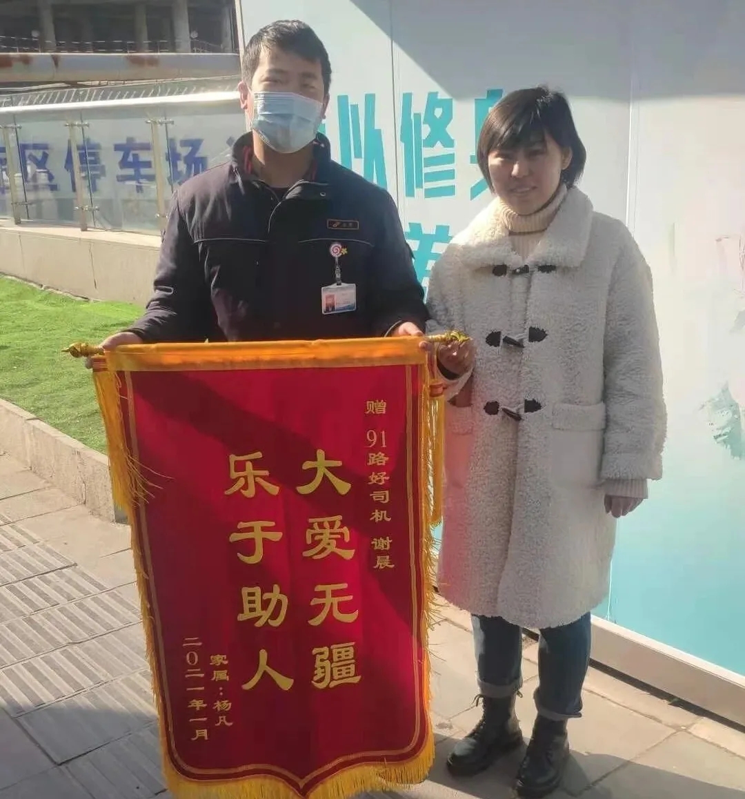 1月18日上午,老人的女兒帶著錦旗來到了91路車隊。原來她媽媽患有阿爾茨海默癥,當天是她爸爸帶著媽媽到市中心逛街,一不小心讓媽媽走丟了。在聯系上謝師傅前,她媽媽已經走失近兩個小時了。幸虧遇到了好心的公交司機謝師傅,并一直在調度室陪著老人。今天她特意來到車隊當面表示感謝。