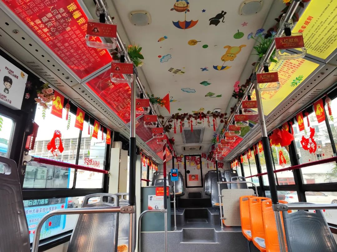 50余輛主題宣傳車車廂內(nèi)以中國紅為主色調(diào),在扶手、廣告展板、車廂尾部等醒目位置布置了黨的二十大報(bào)告內(nèi)容,還對黨的二十大報(bào)告以“數(shù)”讀、一圖速覽的形式,尤其是對二十大報(bào)告里黨的中心任務(wù)等重要提法、二十大報(bào)告金句等內(nèi)容做了重點(diǎn)展示。一幅幅主題鮮明、引人入勝的宣傳展板呈現(xiàn)在市民乘客面前,方便公交職工在工作間隙、廣大市民在乘車途中充分利用碎片時(shí)間學(xué)習(xí)黨的二十大精神。此外,部分公交車上還配置了“便民服務(wù)箱”,備有應(yīng)急藥品、口罩、消毒濕巾等,以實(shí)際行動(dòng)踐行黨的二十大精神。